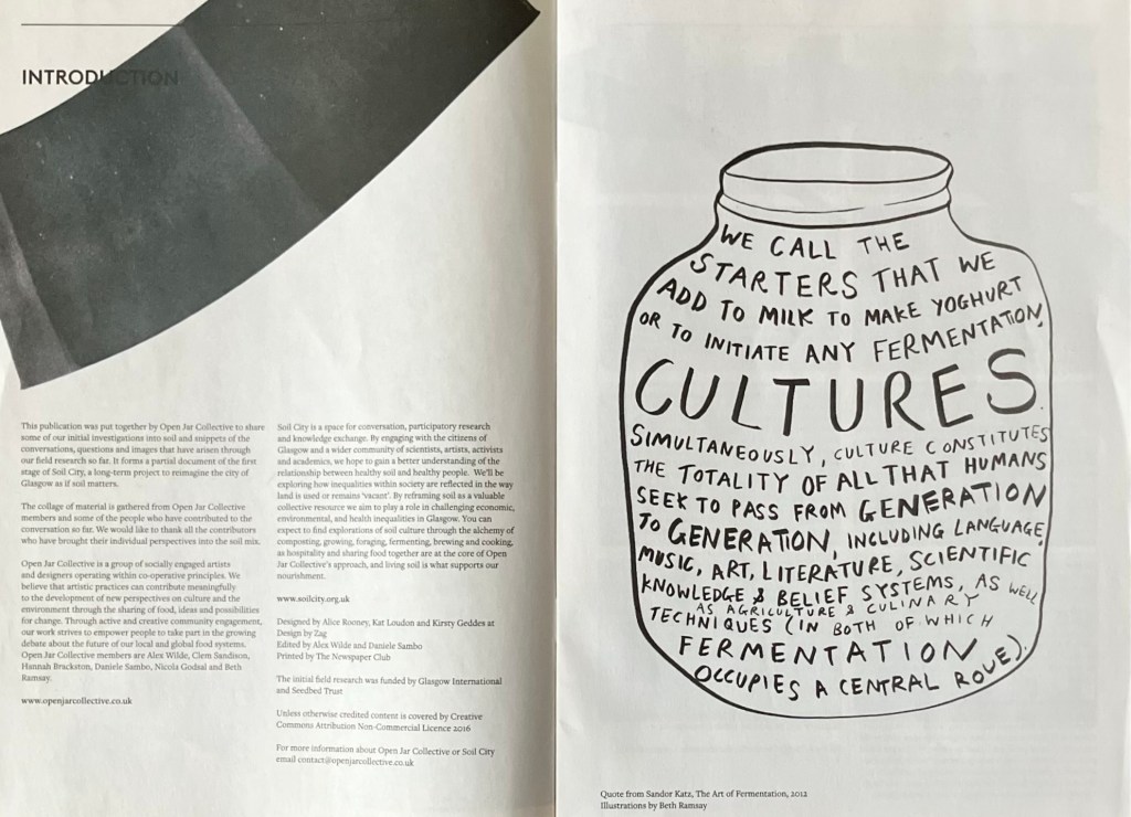Launched at Glasgow International 2016, Soil City was a long term project by Open Jar Collective, engaging with the citizens of Glasgow and a wider community of scientists, artists and activists, to reimagine the city as if soil matters. We created a newsprint zine with writing, illustrations, photos and contributions from other artists and collaborators.